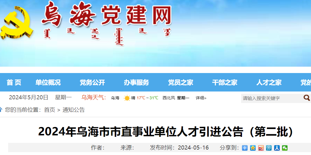 小編根據(jù)中共烏海市委組織部發(fā)布”2024年烏海市市直事業(yè)單位人才引進公告(第二批)“得知,2024內蒙古烏海市直事業(yè)單位人才引進報名時間為5月24日至5月30日,詳情如下: