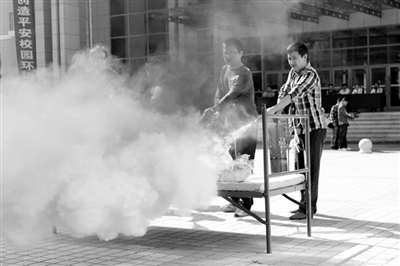 同學(xué)們?cè)趯W(xué)習(xí)使用滅火器。 記者 李波/攝近日,哈工大針對(duì)大學(xué)新生舉行了大學(xué)生公寓消防疏散演練,目的是為了全面加強(qiáng)住校大學(xué)生及教職員工的消防安全教育,提高大家應(yīng)對(duì)火災(zāi)等突發(fā)事件的能力,特別是讓同學(xué)們?cè)谧⌒F陂g真真切切地體會(huì)到火災(zāi)事故中如何進(jìn)行逃生自救。消防員向參與演練的同學(xué)們講解了火場(chǎng)疏散逃生的方法,還為同學(xué)們現(xiàn)場(chǎng)演示了如何正確使用滅火器材撲救初起火災(zāi)的消防技能。