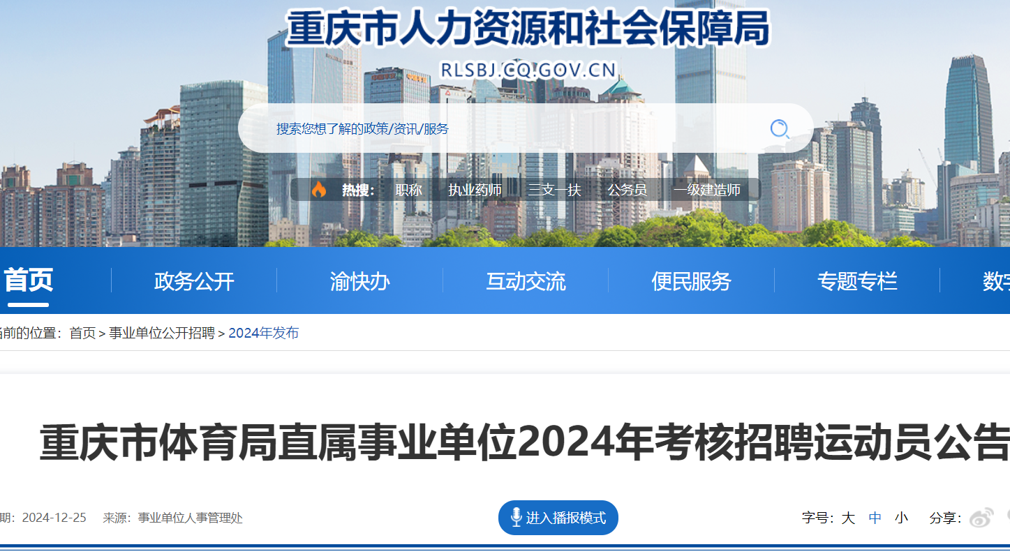 小編根據(jù)重慶市人力資源和社會保障局發(fā)布“重慶市體育局直屬事業(yè)單位2024年考核招聘運動員公告”得知,2024重慶市體育局直屬事業(yè)單位考核招聘運動員104人,報名時間12月30日至6日。