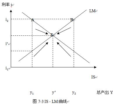 在E點上,總產(chǎn)出等于總需求(IS),貨幣需求量等于貨幣供應量(LM)。在其它任何點上,兩個均衡條件至少有一個不滿足,從而市場力量必然促使經(jīng)濟活動向共同均衡點E靠近。例如點A,點A雖然滿足了經(jīng)濟均衡的條件,但由于利率( )高于均衡利率( ),故貨幣需求小于貨幣供應。由于人們貨幣持有額多于意愿持有額,所以,人們將購買債券,引起債券價格上漲,利率下降,這勢必增加計劃投資支出和總產(chǎn)出。于是經(jīng)濟活動沿著IS曲線向下移動,直至利率降至 ,總產(chǎn)出升至 ,使經(jīng)濟處于均衡點E。再如點B,點B表示貨幣需求等于貨幣供給,但產(chǎn)出( )高于均衡水平 ,也超過總需求。由于企業(yè)無法售出所有產(chǎn)品,故非計劃存貨增加,企業(yè)必然削減生產(chǎn),降低產(chǎn)出。產(chǎn)出的下降意味著對貨幣的需求減少,利率下降,于是,經(jīng)濟沿LM曲線下移,直到均衡點E為止。