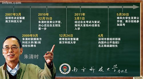南科大籌建大事記。 (CFP/圖) “朱校長也非常難,我很同情他”學術團隊遲遲未能組建,也給行政管理團隊帶來了影響。按照朱清時的想法,在這所去行政化的學校里,應該先有學術團隊,然后再確定管理隊伍。