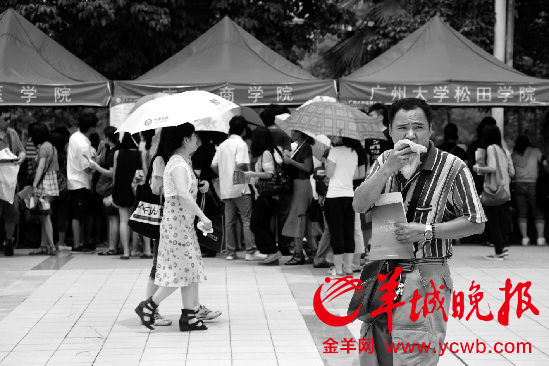 “太曬了!來(lái)咨詢(xún)一趟,擠公交、地鐵不說(shuō),人都要烤焦了!”昨日上午的咨詢(xún)會(huì)在廣州大學(xué)圖書(shū)館外的露天廣場(chǎng)舉行,除了咨詢(xún)臺(tái)上方有小小的遮陽(yáng)頂篷,廣場(chǎng)大部分都暴露在陽(yáng)光下,廣州6月的驕陽(yáng)把考生、家長(zhǎng)們曬得痛苦不堪。