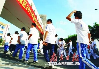 昨日,眾多考生步入南城中學(xué)考點參加生物和地理考試。蘇仕日 攝 南方日報訊 (記者/吳少敏)昨日,東莞中考啟動,6.29萬余初二年級的考生參加了生物、地理科考試,成績將計算入明年的中考成績。昨日9時,6.29萬余考生在全市56個考點中開始了地理科的考試。10時10分,又參加了生物科的考試。