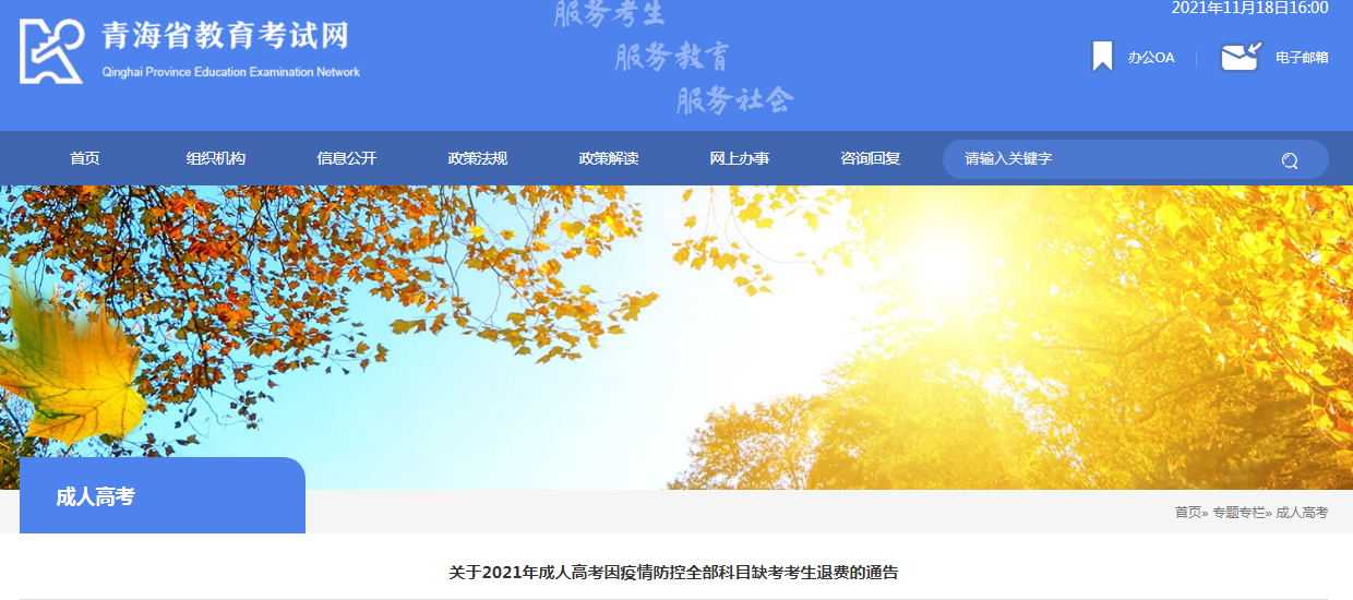青海省教育招生考試院決定對(duì)2021年10月成人高考期間因我省疫情防控原因全部科目缺考考生進(jìn)行退費(fèi),報(bào)名費(fèi)已于11月17日按原報(bào)名繳費(fèi)渠道全額退回,請(qǐng)考生及時(shí)查詢退款詳情。