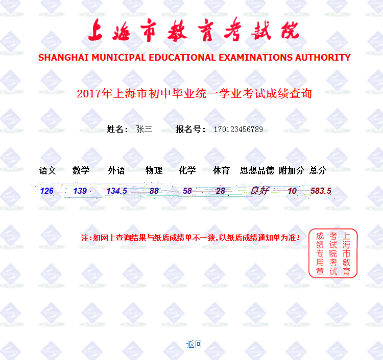 2017年上海市初中畢業(yè)統(tǒng)一學(xué)業(yè)考試成績查詢結(jié)果界面示例如下: