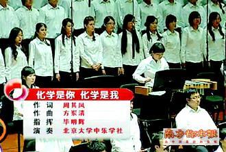 而這段視頻來自今年5月24日“慶祝2011國際化學(xué)年暨北京大學(xué)化學(xué)文化節(jié)開幕”晚會,為其中第三個(gè)節(jié)目。2011年是聯(lián)合國確定的“國際化學(xué)年”,其中文網(wǎng)站的主題就是“化學(xué) 我們的生活 我們的未來”。新華網(wǎng)有關(guān)這次開幕式的一篇報(bào)道稱,“雖說是被學(xué)生‘逼’出來的‘拋磚引玉’之作,周其鳳表示有更大的‘野心’:希望有更多人喜歡,并因此喜歡上化學(xué);還希望這首歌能走進(jìn)化學(xué)課本,傳唱下去”。