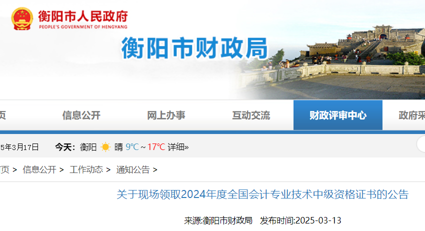 小編根據衡陽市財政局發(fā)布“關于現場領取2024年度全國會計專業(yè)技術中級資格證書的公告”得知,2024年湖南衡陽中級會計職稱證書領取時間工作日上午9:00-11:00,領取地點衡陽市財政局317辦公室。