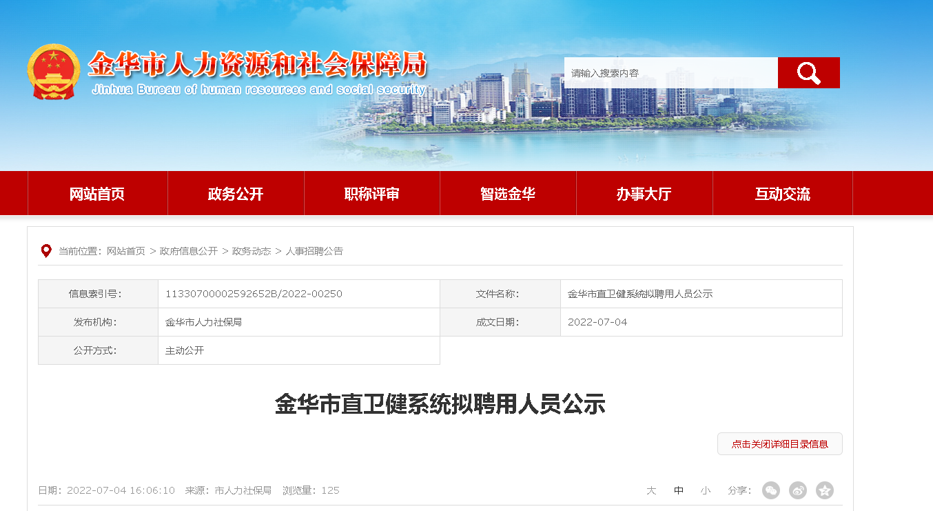 2022浙江金華市直衛(wèi)健系統(tǒng)擬聘用人員公示已出,公示期限:2022年7月5日-2022年7月13日(共7個(gè)工作日),現(xiàn)將招聘公告原文發(fā)布如下: