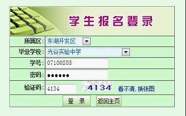 點(diǎn)擊“報名”圖標(biāo),出現(xiàn)考生登錄界面,選擇所屬區(qū)、畢業(yè)學(xué)校,輸入學(xué)號和密碼,學(xué)號為8位,密碼為6位,如下圖所示:
