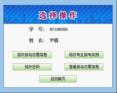 7.考生再次登陸,進(jìn)入考生管理頁面。可以修改報名志愿信息、修改報考類別,修改密碼、查看報名志愿信息。如下圖所示: