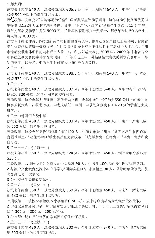 7月3日晚,蘭州市教育局根據(jù)今年城市四區(qū)普通高中招生計劃,并結(jié)合中考成績整體水平,分別確定了城市四區(qū)省級示范性高中(含獨立高中)、普通高中招生錄取最低控制分數(shù)線:省級示范性高中(含獨立高中)錄取最低控制分數(shù)線為505分,普通高中錄取最低控制分數(shù)線為400分。兩分數(shù)線同比去年分別提高5分和10分。