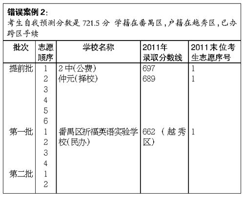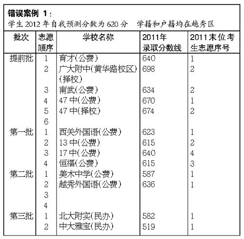 朱虹表示,從這個(gè)學(xué)生的志愿填報(bào)情況不難看出,該生是具有廣州市戶籍或者是不具有廣州市戶籍但享受政策性照顧借讀,能報(bào)讀廣州市的公辦高中公費(fèi)及擇?;蛘呤敲褶k高中;其次是學(xué)生的自我預(yù)測(cè)分?jǐn)?shù)是高過(guò)2011年提前批的優(yōu)先投檔線30多分,應(yīng)該說(shuō)2012年上提前批的優(yōu)先投檔線把握是非常大的。