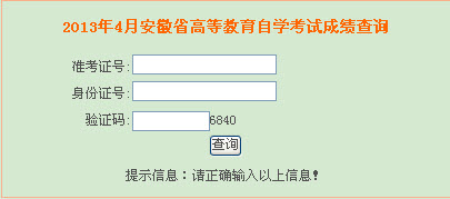安徽省2013年4月高等教育自學考成績查詢?nèi)肟谝呀?jīng)開通,考生可按照提示輸入準考證號、身份證號查詢自考成績。
