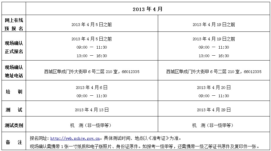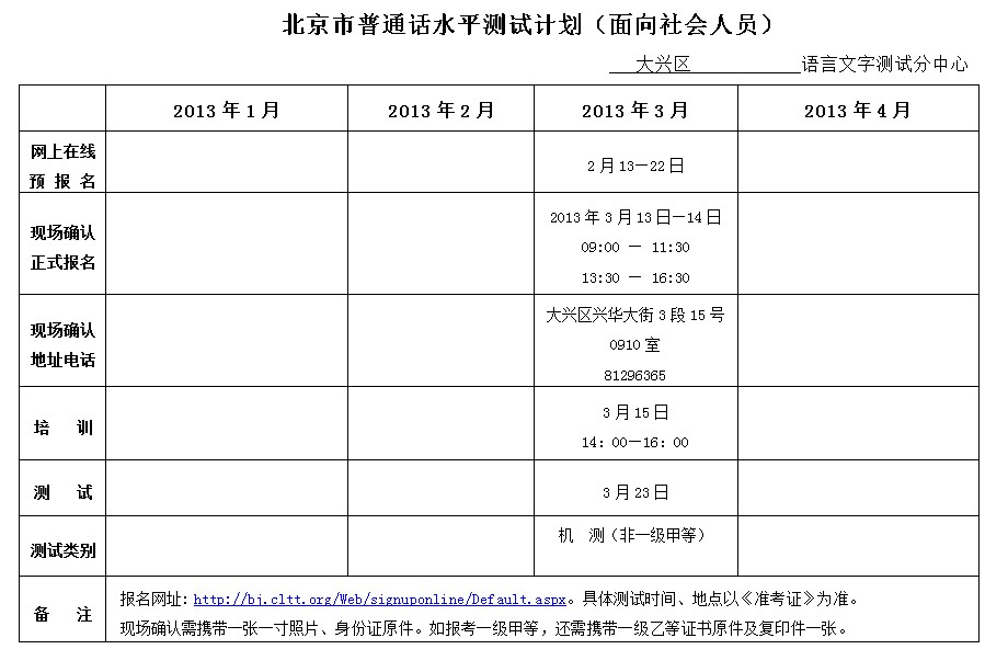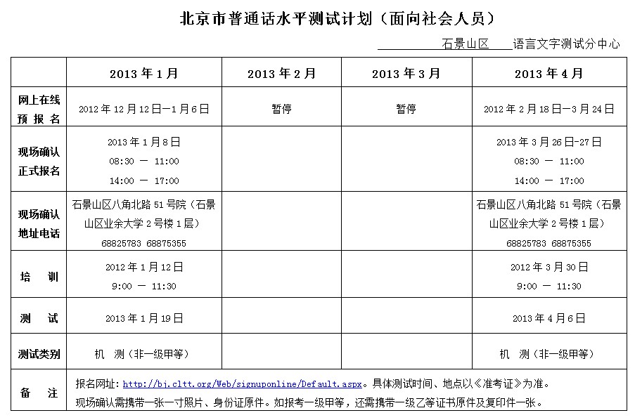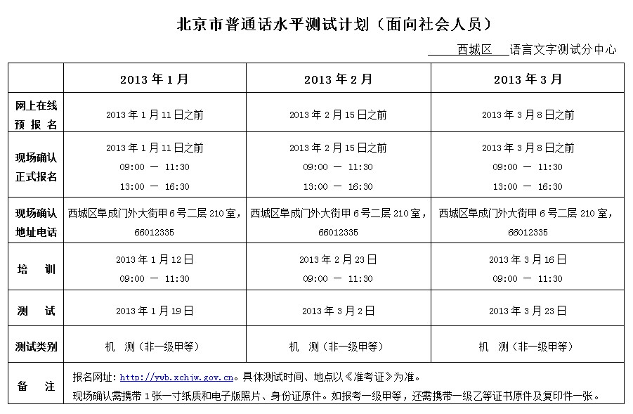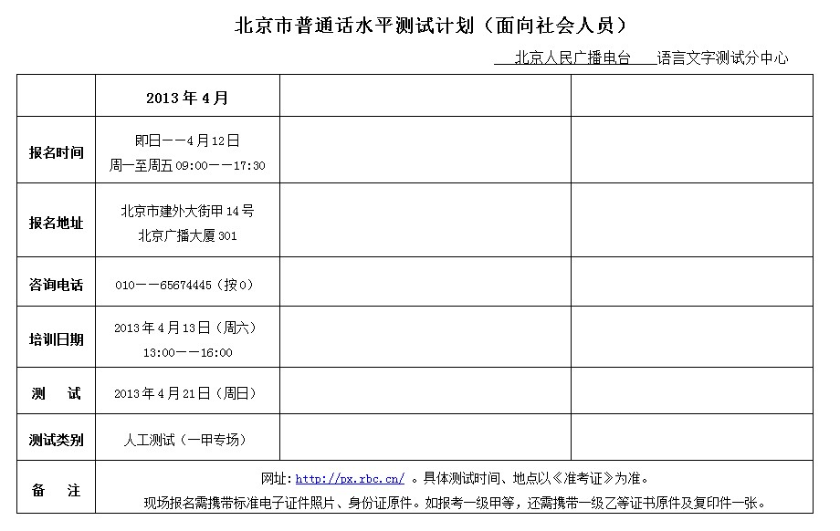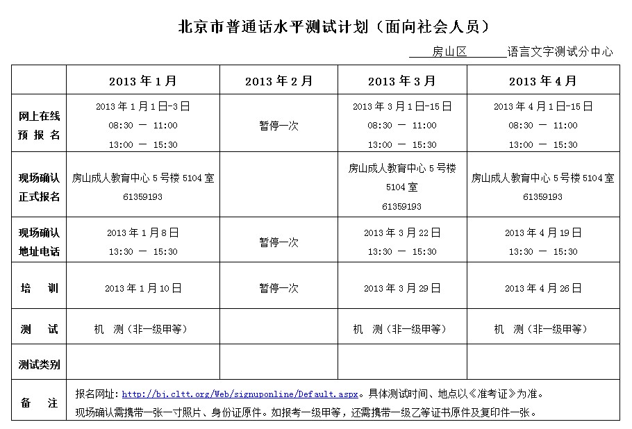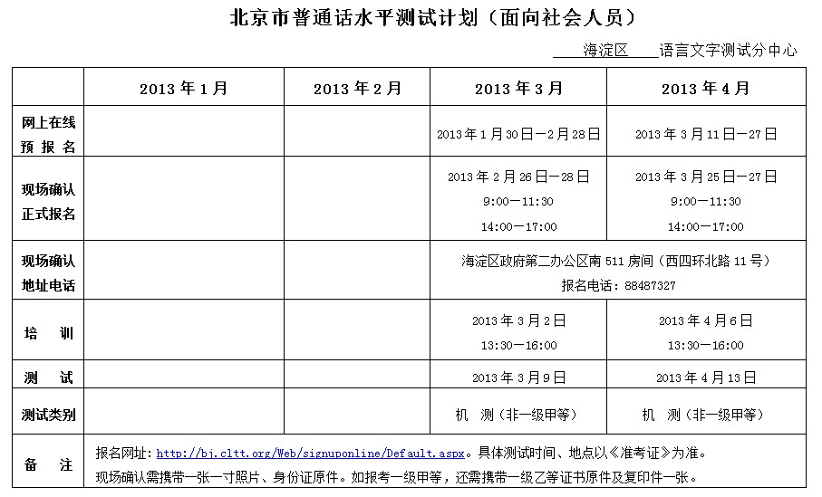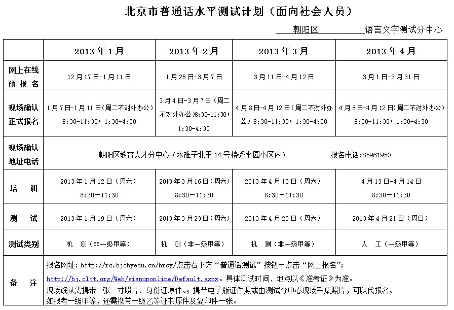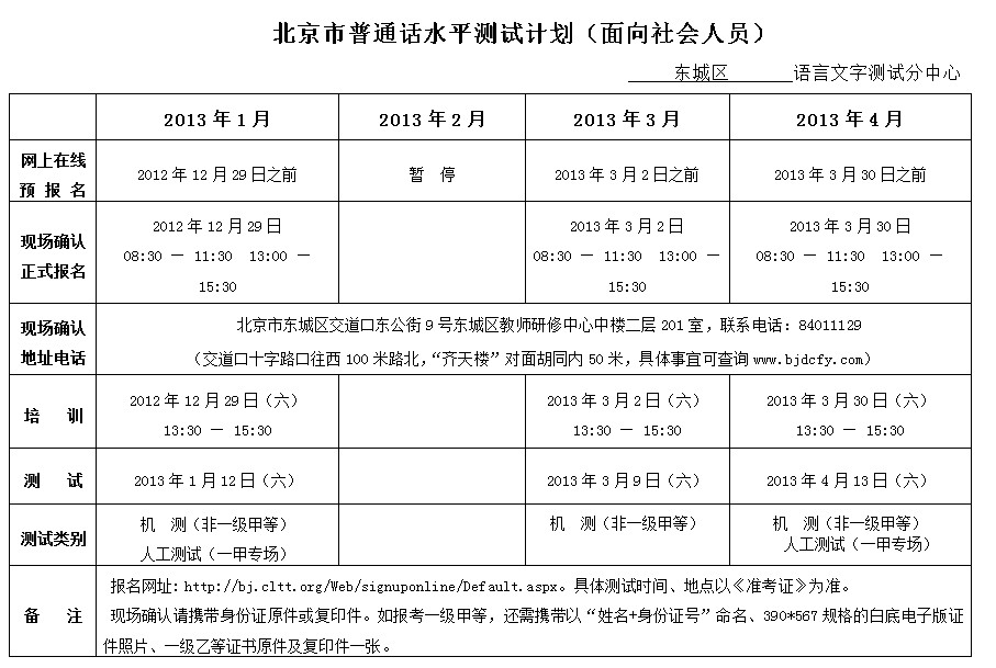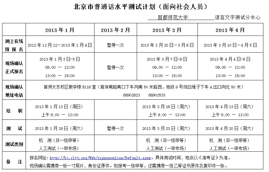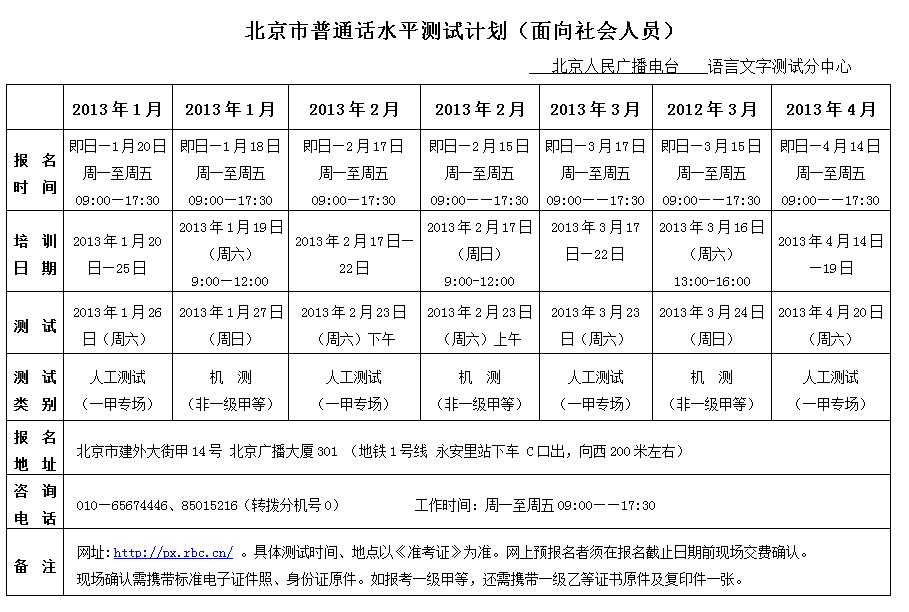 北京2013年1-4月普通話考試時間