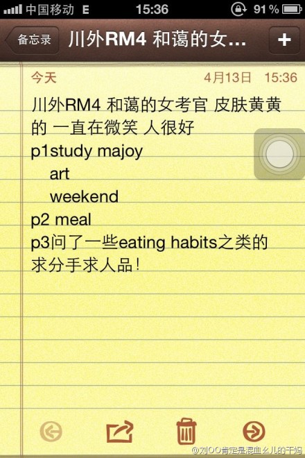 上財(cái)410 1420 白人老頭不冷不熱 有說byebye p1 work art museum dance p2 vehical p3 圍繞car展開。。順便感謝考場給我水的老師,從小到大第鬼使神差記錯(cuò)口試時(shí)間,驚覺的時(shí)候晴天霹靂。好不容易趕到考場就差跑暈了。。好傻阿。。從此以后必須好好攢rp。?;丶覉?bào)名下,哎西安交大RM1,14:40,考官人超級nice,50多歲的男的,態(tài)度蠻好,挺有耐心的。part1,the place you live。part2,present。part3,關(guān)于part2展開西交,RM4,part 1城市part 2一見如故的人part 3各種朋友家人