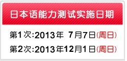 日本語能力測試將每年舉辦兩次,分別于7月和12月的第一個星期日實施。由日本得知2013年日本語能力測試(JLPT)考試時間為:2013年7月7日;2013年12月1日。 若有變動,另行通知,具體時間以教育部考試中心發(fā)布的公告為準(zhǔn)。