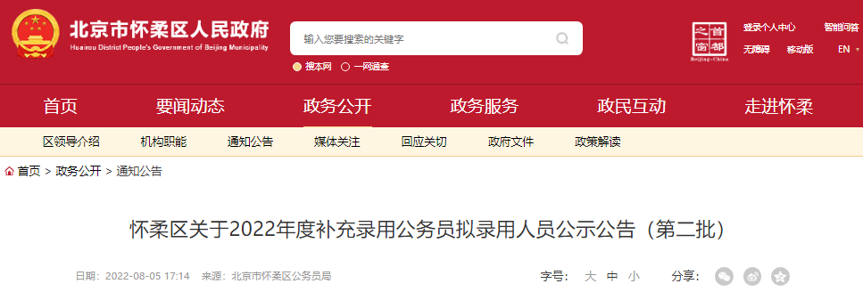懷柔區(qū)關(guān)于2022年度補(bǔ)充錄用公務(wù)員擬錄用人員公示公告(第二批)