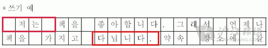 其他情況:如果已經(jīng)寫到格子后一個(gè)字, 即使接下來應(yīng)該隔寫也不要在第二行空一個(gè)格,因?yàn)轫n語中空格的作用是隔開單詞方便閱讀,既然已經(jīng)隔行了,就不再需要隔寫。例:사과를 먹다,“를”后面需要空一格再寫“먹다”,但如果“사과를”已經(jīng)寫到這一行的后一格了,먹다要另起一行的話,먹다前面就無需空一格,而是直接寫在第二行的第一個(gè)格子里就可以了。
