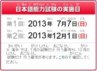 日本語(yǔ)能力測(cè)試將每年舉辦兩次,分別于7月和12月的第一個(gè)星期日實(shí)施。由日本得知2013年日本語(yǔ)能力測(cè)試(JLPT)考試時(shí)間為:2013年7月7日;2013年12月1日。 若有變動(dòng),另行通知,具體時(shí)間以教育部考試中心發(fā)布的公告為準(zhǔn)。