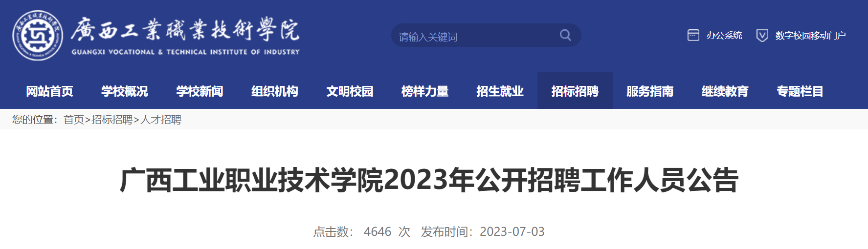 2023年廣西工業(yè)職業(yè)技術學院公開招聘工作人員78名,報名時間:2023年7月3日至2023年7月11日17:00止?,F(xiàn)將招聘公告原文發(fā)布如下: