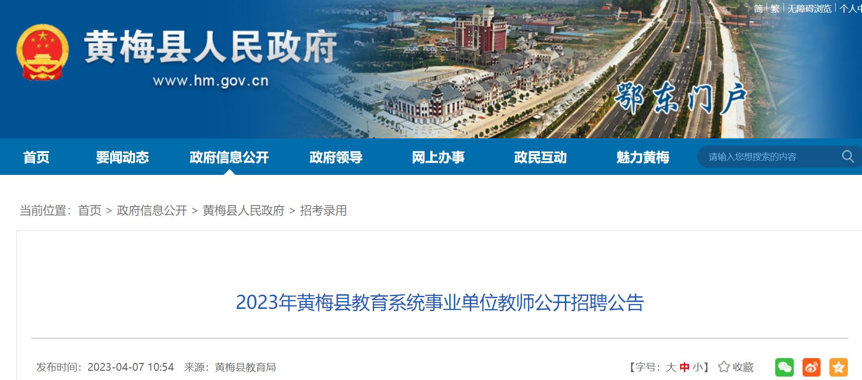 《2023年黃梅縣教育系統(tǒng)事業(yè)單位公開(kāi)招聘教師公告》在黃梅縣人民政府網(wǎng)站(http://www.hm.gov.cn)面向社會(huì)公開(kāi)發(fā)布。