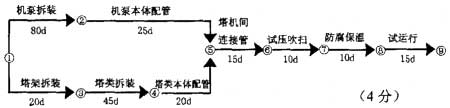 附加說明:管道試壓吹掃與管道、設(shè)備防腐保溫兩工作之間有搭接作業(yè)的可能(1分);考慮試運(yùn)行不可預(yù)見因素多,試運(yùn)行15d時間有壓縮余地,這三項(xiàng)工作存在縮短工期的潛力(1分)。