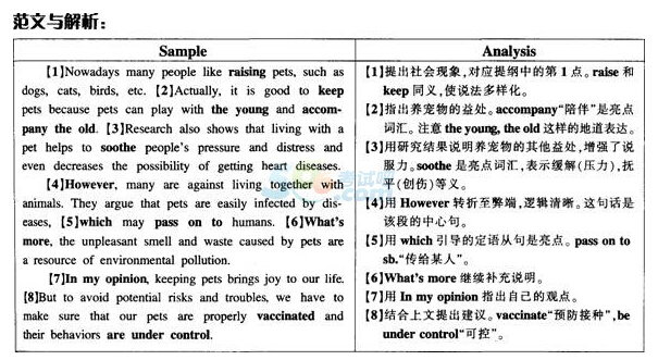 第2段分析利弊,根據(jù)作文的標(biāo)題可知此段是重點內(nèi)容。養(yǎng)寵物的益處可以從很多方面說(比如消除孤獨感、豐富日常生活、獲得快樂等),弊端可以從養(yǎng)寵物減少了人與人之間的交流機會、可能使人被傳染疾病、可能導(dǎo)致空氣異味等方面來說。