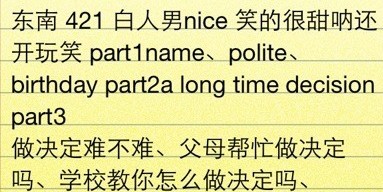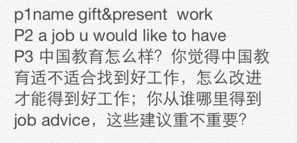 西大 rm305 高能預(yù)警!?。髡f中的5分殺 p1 name,where are you from,關(guān)于sunshine的問題,關(guān)于history的問題 p2 a decision you made p3 什么樣的decision父母可以幫kids make 什么樣的不可以,老師和父母誰更適合幫kids make decisions,還有關(guān)于job之類的。