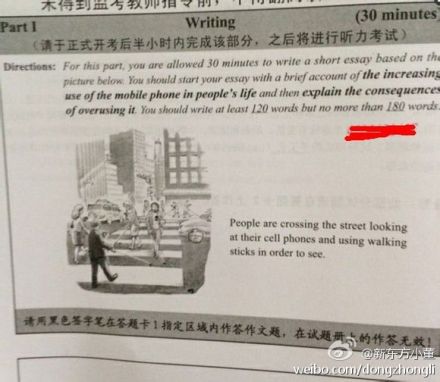 如圖所示,我們可以看到有很多的人正在過馬路,他們沒有仔細看路,卻都盯著自己的手機并且用一根拐杖代替他們看路。很明顯,他們都著迷于手機,甚至忽視了自身安全。