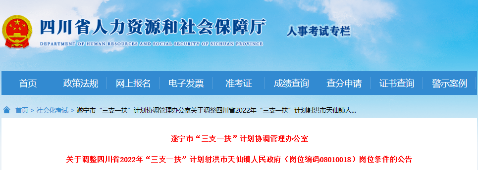根據(jù)射洪市招募需求實(shí)際,現(xiàn)對(duì)四川省2022年“三支一扶”計(jì)劃射洪市天仙鎮(zhèn)人民政府(崗位編碼08010018)招募崗位條件進(jìn)行調(diào)整,調(diào)整情況公告如下。