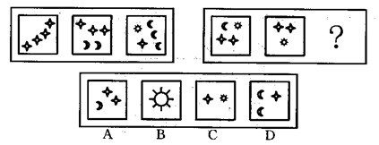 4.B[解析]本題為數(shù)量類(lèi)題目。第一組圈元素的種類(lèi)數(shù)分別是1、2、3,第二組圈前兩個(gè)圖元素的種類(lèi)數(shù)為3和2,故問(wèn)號(hào)處的圖形元素的種類(lèi)數(shù)應(yīng)為1,因此本題選B。