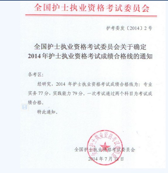 2014年中國(guó)衛(wèi)生人才網(wǎng)執(zhí)業(yè)護(hù)士考試合格分?jǐn)?shù)線(xiàn)已公布:專(zhuān)業(yè)實(shí)務(wù)77分,實(shí)踐能力79分。一次考試通過(guò)兩個(gè)科目為考試成績(jī)合格。
