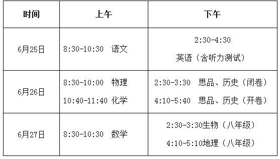考試時間共安排3天。語文、數學、英語三科考試時間各120分鐘;思想品德、物理考試時間各90分鐘;化學、生物、歷史、地理考試時間各60分鐘。體育考試時間、方式、項目另文通知。