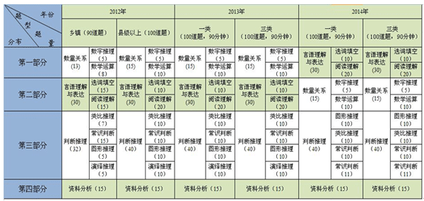 數(shù)字推理包羅萬象:倍數(shù)數(shù)列、分式數(shù)列與差數(shù)列結(jié)合、多次方數(shù)列、組合數(shù)列、數(shù)位組合數(shù)列在試卷中均有體現(xiàn)。圖形推理題型全面涉及類比型,順推型,元素重組,九宮格型。類比推理考點涵蓋邏輯關(guān)系、言語關(guān)系和常識關(guān)系。言語理解仍考選詞填空和閱讀理解兩種題型,與2013年保持一致,但具體考查題型略有改變,更加全面,如片段閱讀增加了對承接敘述的考查。