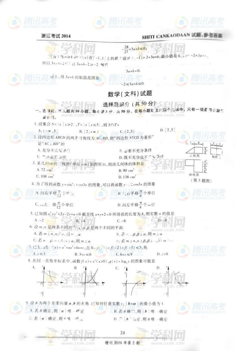 2014年浙江高考數(shù)學(xué)參考答案:理數(shù)(完整版)