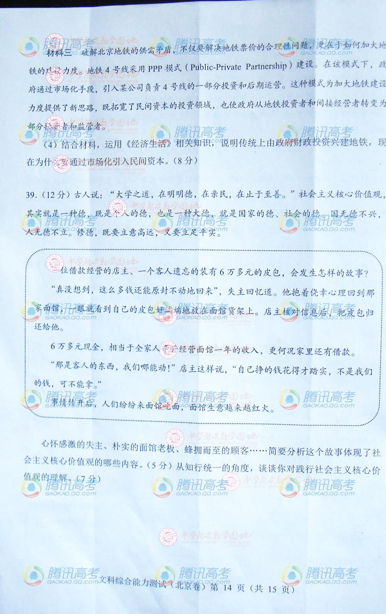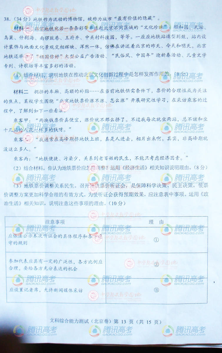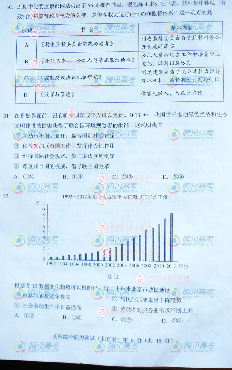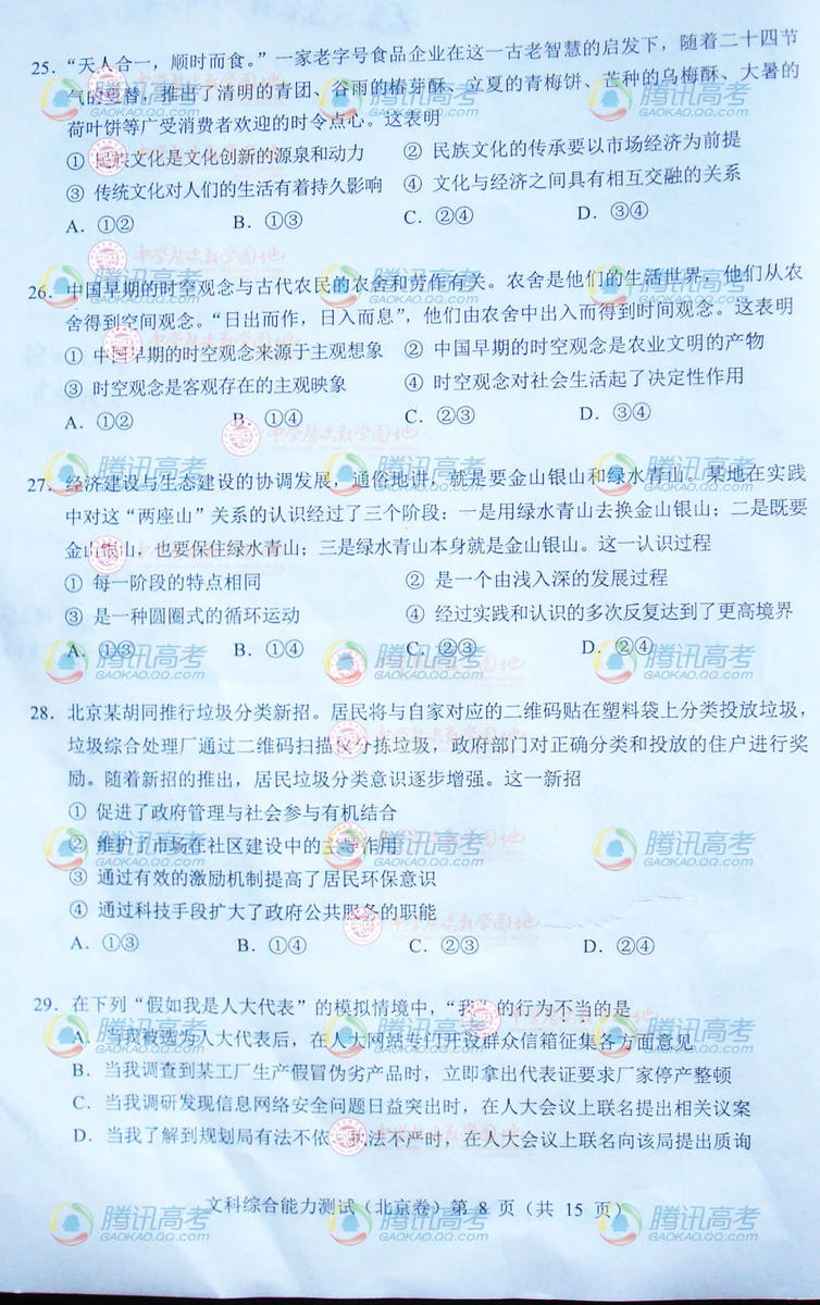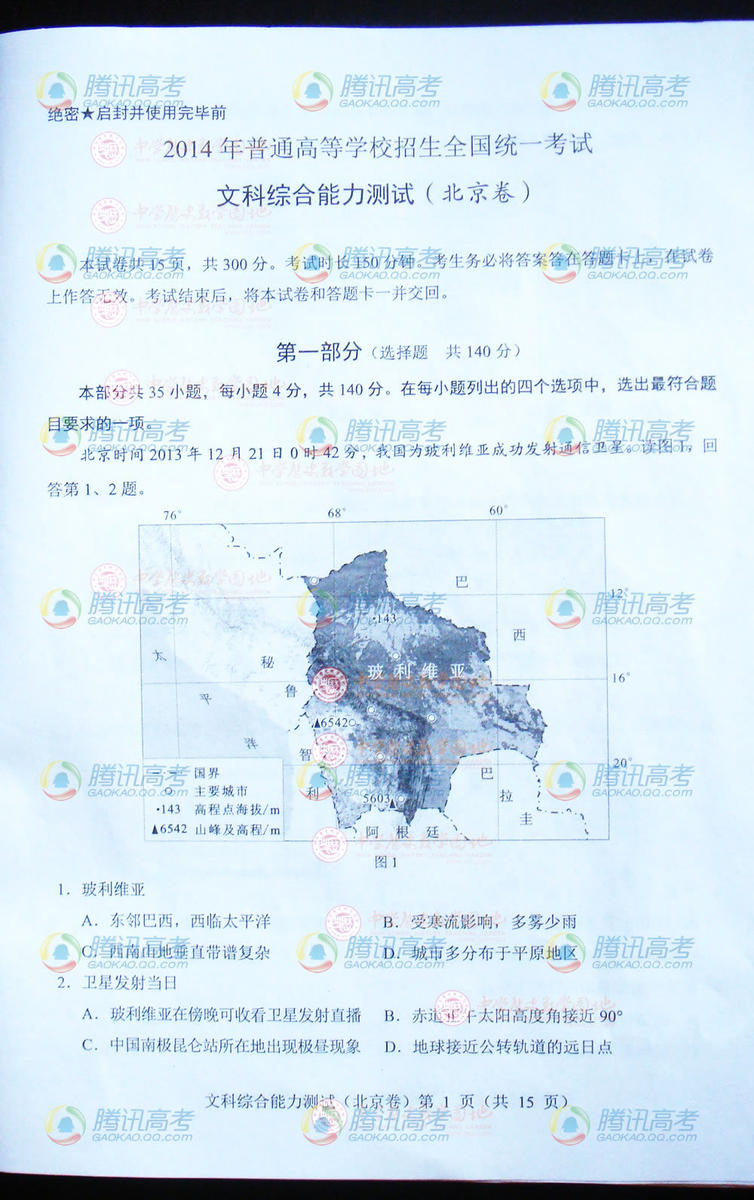 2014北京高考文綜試題(完整版)