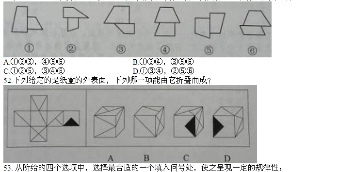 51.把下面的六個(gè)圖形分成兩類,使每一類圖形都有各自的共同特征或規(guī)律,分類正確的一項(xiàng)是: