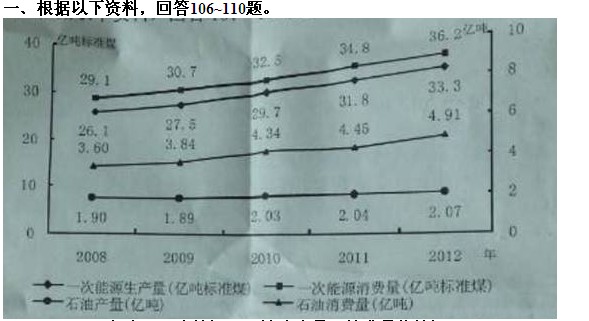 108.2008-2012年間,全國(guó)石油消費(fèi)量超過全國(guó)石油產(chǎn)量2倍的年份有幾個(gè)?