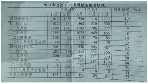 115.關(guān)于2013年1~5月保險(xiǎn)業(yè)經(jīng)營(yíng)狀況,能夠從上述資料中推出的是: