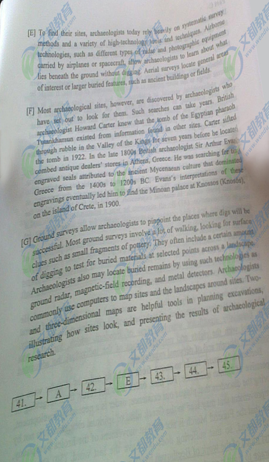 43. 此題排在E項(xiàng)之后。E選項(xiàng)后一句提到天空的搜尋,而在G選項(xiàng)的開(kāi)頭提到地面搜尋,正好形成對(duì)應(yīng),所以為正確答案。