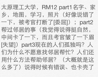 口語6.6 太原理工rm3 趴1work or study name 喜歡的tv show 會給你以后的小孩看什么 帕2許久未見的朋友 帕3怎么維系友誼 你認為和老朋友保持友誼重要嗎 白人考官蠻嚴肅問了我好多問題。