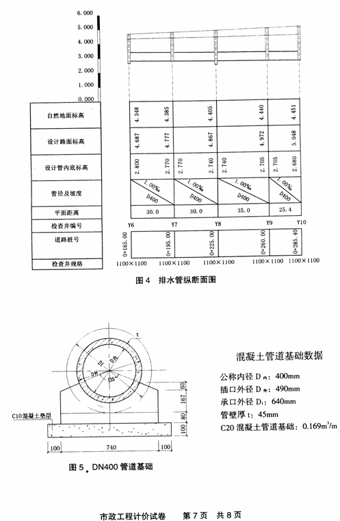 第二題 某市政排水管道工程,采用Φ400×3000㎜鋼筋混凝土承插管(0型膠圈接口),人機配合下管,135°現(xiàn)澆混凝土管道基礎,其中道路樁號K+165.00~K+285.40段管道縱斷面和管道基礎如圖4、5所示。其他有關說明如下:
