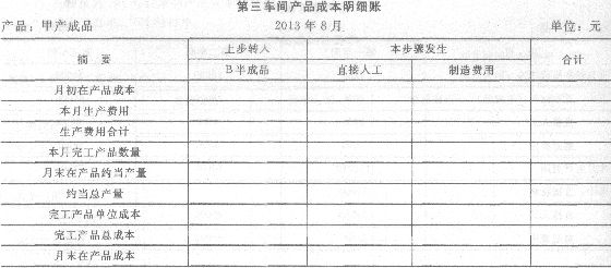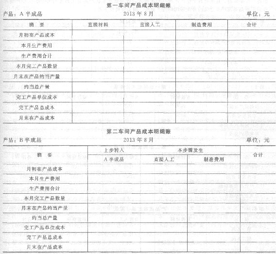 (1)根據(jù)以上資料采用逐步結(jié)轉(zhuǎn)分步法(綜合結(jié)轉(zhuǎn)方式)計(jì)算甲產(chǎn)品及其A半成品、B半成品成本(完工產(chǎn)品和月末在產(chǎn)品成本按約當(dāng)產(chǎn)量法分配計(jì)算),登記產(chǎn)品成本明細(xì)賬(填寫以下各表)。