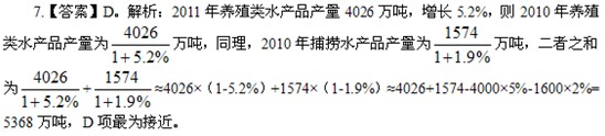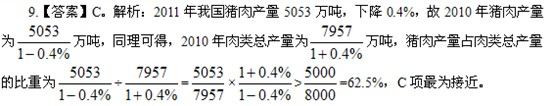 8.【答案】A。解析:2011年農(nóng)村居民人均純收入增長(zhǎng)了(6977-5919)÷5919>1000÷6000≈16.7%,糧食種植面積增長(zhǎng)了70÷(11057-70)<70÷10000=0.7%,棉花產(chǎn)量增長(zhǎng)了10.7%,糧食產(chǎn)量增長(zhǎng)了(57121-54648)÷54648<3000÷50000=6%,明顯的為A項(xiàng)。