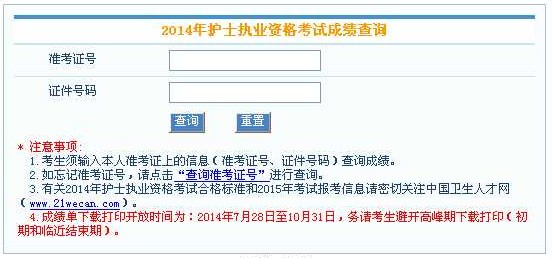 2014年護士資格考試成績查詢系統(tǒng)已開通,考生須登錄官方網(wǎng)站中國衛(wèi)生人才網(wǎng)(http://www.21wecan.com/),輸入本人準(zhǔn)考證上的信息(準(zhǔn)考證號、證件號碼)查詢成績或直接點擊下面圖片進行成績查詢。