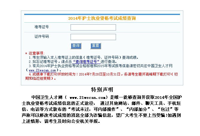 衛(wèi)生網(wǎng)2014成績查詢網(wǎng)站:www.21wecan.com,考生進(jìn)入中國衛(wèi)生人才網(wǎng),憑借準(zhǔn)考證號查詢自己的成績