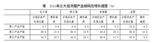 三大經(jīng)濟(jì)圈中,2010年三次產(chǎn)業(yè)增長(zhǎng)速度均超過(guò)全國(guó)平均水平的有幾個(gè)?