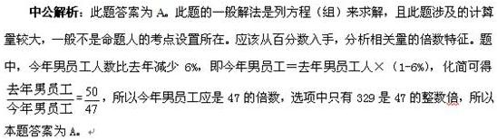 【例題3】某公司去年有員工830人,今年男員工人數(shù)比去年減少6%,女員工人數(shù)比去年增加5%,員工總數(shù)比去年增加3人。問今年男員工有多少人?