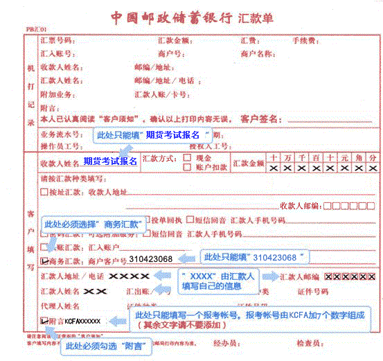 (收款人:期貨考試報名,匯款方式:商務(wù)匯款,商戶客戶號:310423068)