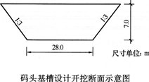 某海港集裝箱碼頭,采用沉箱重力式結(jié)構(gòu),沉箱尺寸為15m×22m×19.5m(寬×長×高),設(shè)計高水位+3.0m,設(shè)計低水位+0.5m,碼頭前沿水深一17.0m。碼頭基槽設(shè)計開挖斷面如下圖所示,采用抓斗式挖泥船施工,計算超深值取0.3m,計算超寬值取1-0m。